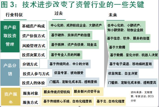 互联网及信息技术在四个方面对资管行业产生了深刻影响。一是降低了信息的不对称性,产品信息和研究信息可以利用互联网快速传播,客户和资管机构获取的信息趋同,获取信息的成本也大大降低。二是提高了信用违约成本,互联网快速提升了信用信息的透明度和可得性,提高了融资方违约的成本。三是降低了行业壁垒,加速金融与非金融的深度融合,使得非传统金融机构依靠渠道和场景优势有更大的机会跨界进入资管服务。四是改变了生产的资源配置流程,过去市场资源配置依赖于价格信号调控,难免存在滞后与错配,现在借助互联网、大数据,客户需求更加显性,资管机构得以更实时更直接地获取细分的客户群体偏好,提供定制化的服务。前两点变化对以信息和信用为生存基础的金融行业带来直接冲击,第三点加剧了行业竞争 ,第四点则要求资管机构重新审视金融资源的布局。此外,新技术对资产管理价值链的各个环节都带来了直接而深刻的影响。