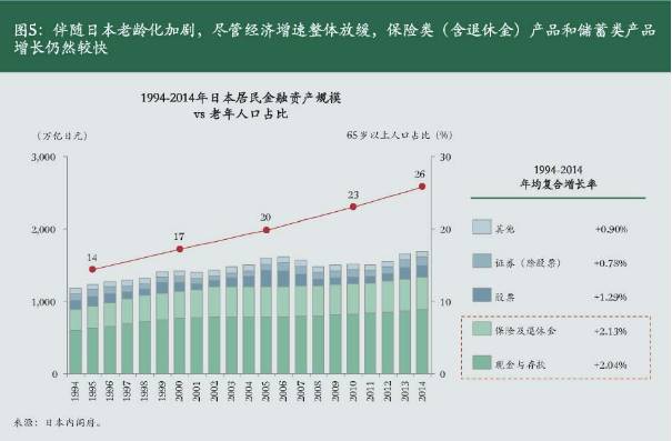 此外,我国老龄化趋势会进一步促进投资理财需求。根据BCG人口数据库的测算,50岁以上的人口占全国人口的比例在2010年为24%,2020年将上升至33%,这十年间退休人口预计增加1.5亿。老龄化趋势在短时间内不可逆转,而现有的社会保障体制仍较难满足日益增长的养老需求。因此,具备保值增值能力和跨期配置属性的金融产品,如商业养老保险、理财规划、理财产品等成为了重要的替代型养老手段,拥有巨大的增长空间。参考日本经验,伴随着老龄化的加剧,可能会出现居民金融资产配置的结构性变化,家庭资产配置整体上会呈现向保险类产品和低风险的储蓄类产品倾斜的趋势。