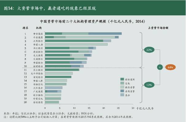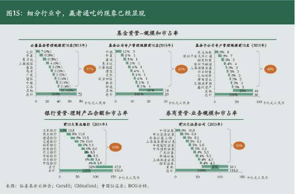 中国资管市场中,“赢者通吃”的现象也已经显现。前十大资管机构管理资产规模市场份额总计32%,前20大资管机构市场份额总计44%,集中度与全球资管市场相近。在细分行业中,“赢者通吃”的现象更加明显。例如,根据2014年底数据,中国前十大银行理财产品余额合计市场份额占比68%;2015年底,前十大公募基金规模合计占比达57%,前十大基金公司专户规模合计占比达49%,前十大基金子公司专户规模合计占比达48%,前十大券商资管规模合计占比50%。