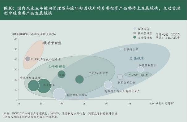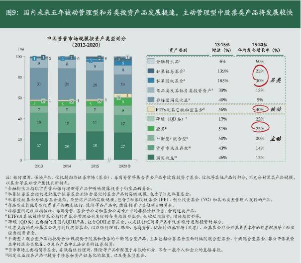 报告在预判未来五年中国资管市场主要发展趋势时表示,随着养老金三大支柱的完善,险资规模扩大,以及银行委外投资需求提升,未来机构资金占比将进一步提高。资产类别上,未来五年,被动管理型和除非标固收外的另类投资产品整体上发展较快;而主动管理型中的股票类、跨境类产品也有较大潜力。