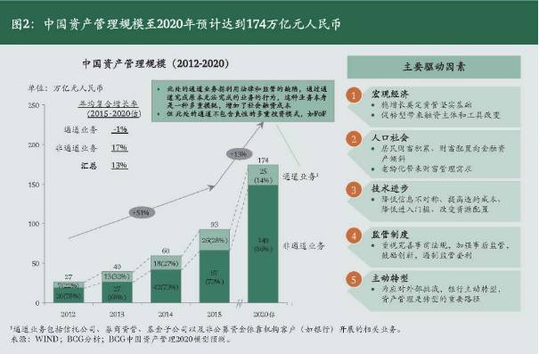 预计2020年,中国资管市场管理资产总规模将达到174万亿元人民币;其中,剔除通道业务后规模约149万亿元,2015-2020年年均复合增长率为17%。这背后的五大支撑动力包括宏观经济“稳增长、促转型”、居民财富积累并向金融资产转移、金融科技进步、监管鼓励、银行业主动转型。