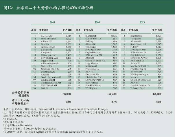 除不同子行业发展快慢不均外,我们从全球市场还观察到一个通行的趋势——资产管理市场“赢者通吃”现象明显。全球资产管理业务的发展经验指出资产管理是一项需要规模效应的业务,成功机构往往在某些特定领域建立规模效应。全球前20大资产管理机构管理资产规模市场份额合计2007年为38%,2009年为41%,2013年为42%,20家机构即占据全球市场近一半。