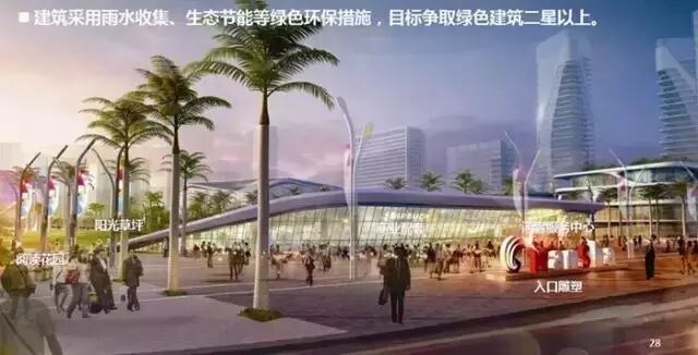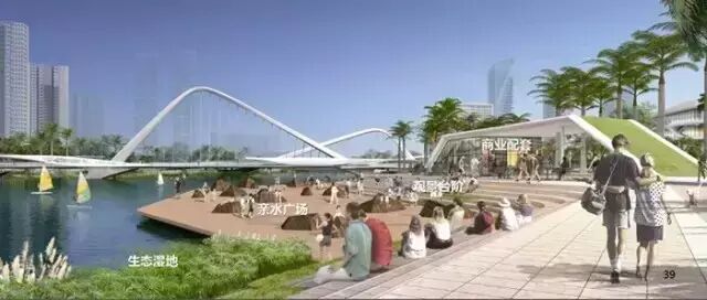 市民广场东段的景观轴线上有阳光草坪+旅游服务中心+浮动舞台+艺术地标+水镜广场共五大景观项目,形成南沙地标景观。