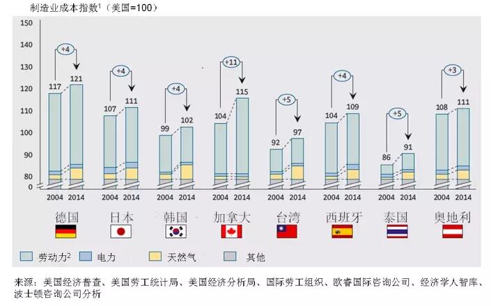 》能源成本。自2004年来,由于页岩天然气资源的大规模开采,北美天然气的价格已经下降了25%-35%。相比之下,波兰、俄罗斯、韩国和泰国等经济体的天然气价格上升了100%-200%。这对使用天然气作为生产进料的化工产业产生巨大影响。类似地,澳大利亚、巴西和西班牙等制造业经济体的工业用电价格也大幅上升。因此,北美以外很多经济体的整体能源成本都比2004年上升了50%-200%。这明显地改变了各国依赖能源的产业的竞争力。