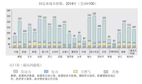 》继续削弱:几个过去十年制造业成本就相对高的经济体竞争力继续削弱,它们的制造业成本高于美国16%-30%。主要原因是生产率的低增长和能源成本提高。竞争力继续削弱的经济体包括:澳大利亚、比利时、法国、意大利、瑞典和瑞士。