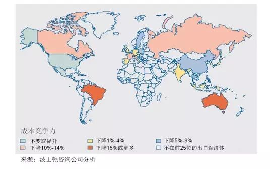 》面临压力:过去一直被认为是低成本制造业基地的几个经济体由于多项因素结合,自2004年来面临着成本优势大幅减弱的压力。例如:据估计,中国相对美国的工厂制造业成本优势已经减弱到5%以下;巴西的制造业成本高于西欧;波兰、捷克共和国和俄罗斯的成本竞争力也相对减弱,目前它们的制造业成本水平与美国相当,仅仅比英国和西班牙低几个百分点。