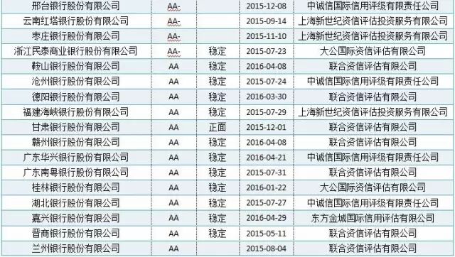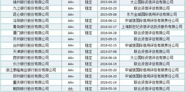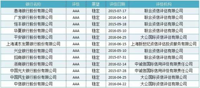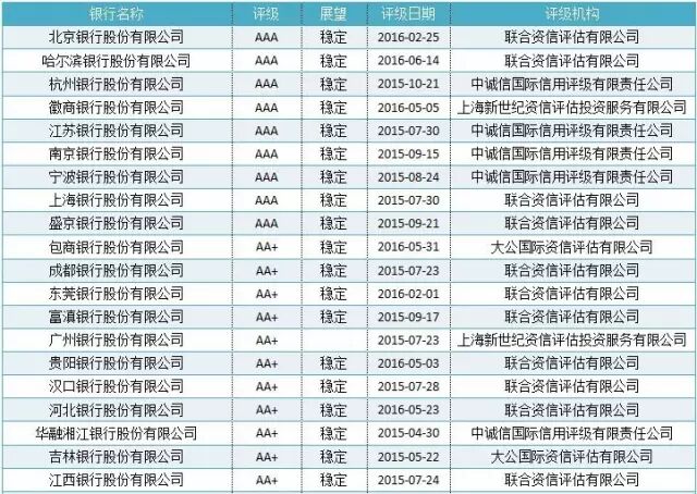 来源:普兰金融(微信号purang31N)一、大型商业银行:6家,评级结果均为AAA二、股份制商业银行:12家,评级结果均为AAA三、城市商业银行:100家,其