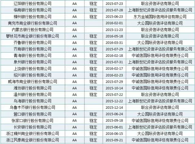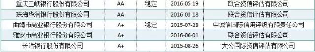 三、城市商业银行:100家,其中AAA评级9家;AA+评级25家;AA评级37家;AA-评级26家;A+评级3家