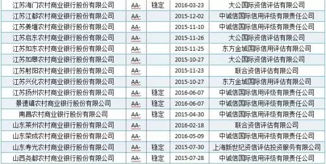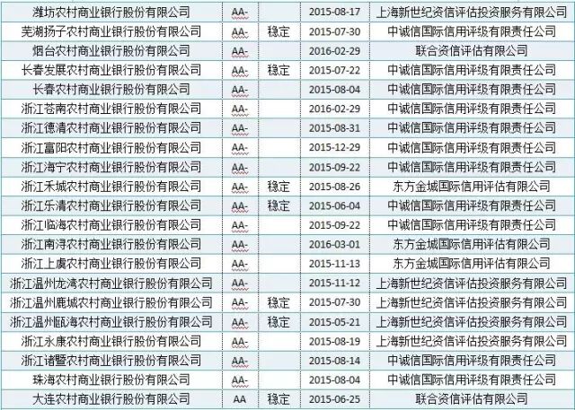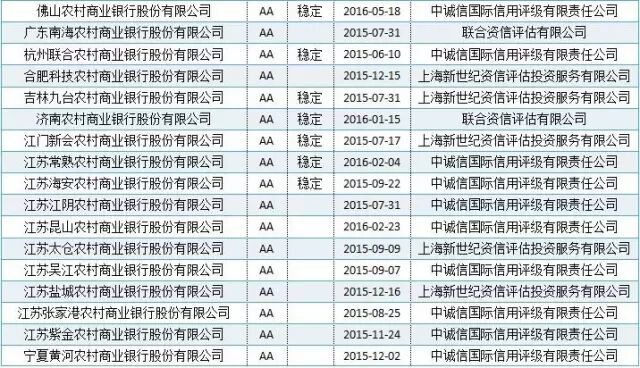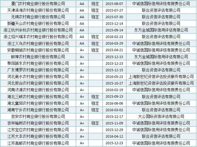 四、农村商业银行:145家,其中AAA评级3家;AA+评级6家;AA评级25家;AA-评级47家;A+评级50家;A评级13家;A-评级1家