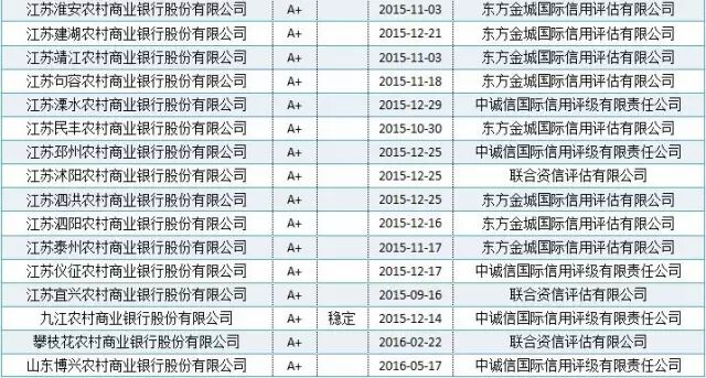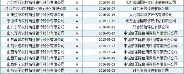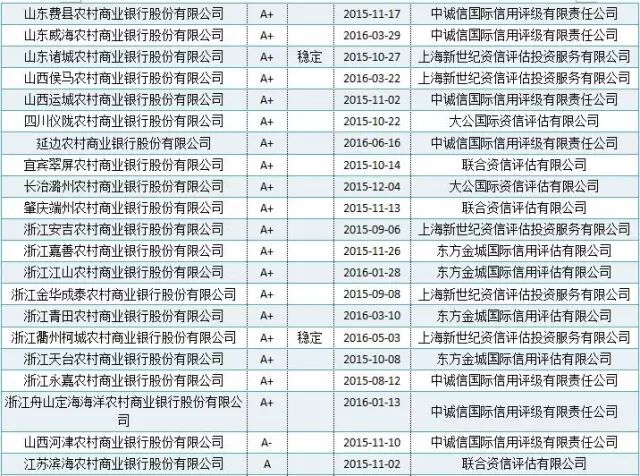 六、农村信用社:16家,其中A+评级5家;A评级10家;A-评级1家