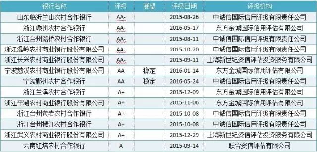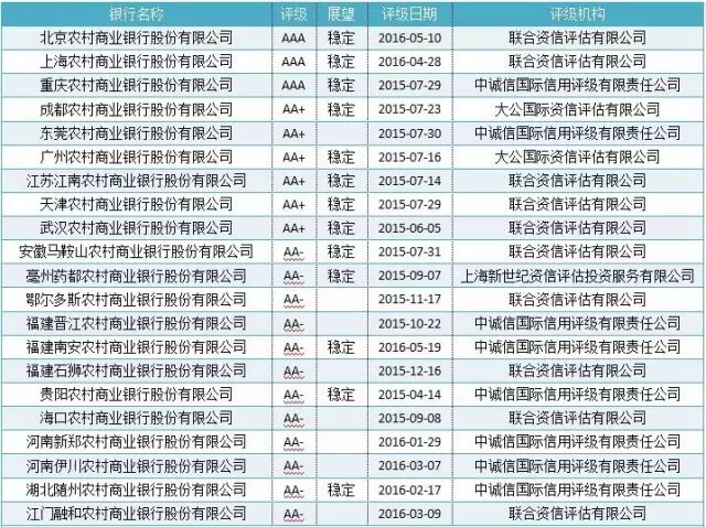 五、农村合作银行:13家,其中AA评级2家;AA-评级5家;A+评级5家;A评级1家