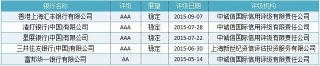 七、外资银行:5家,其中AAA评级4家;AA评级1家