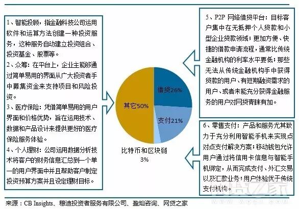 根据报告,Fintechs包括:网络借贷平台、零售支付,智能投顾、众筹、医疗保险、个人理财以及虚拟货币等(参见图1)。