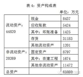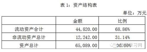 企业总资产为65089万元,其中流动性资产为44820万元,占资产总额的比例为68.86%;非流动资产为20269万元,占据的资产份额为31.14%。具体构成情况见表4