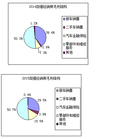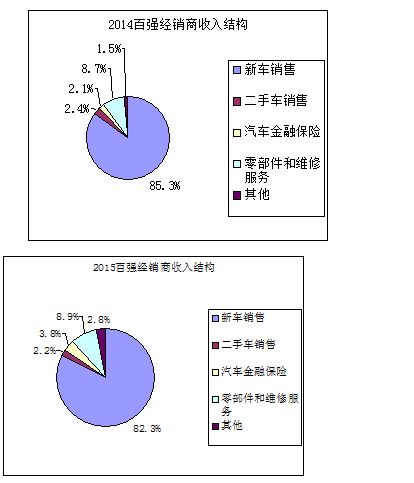 2014年百强的业务结构中,新车销售占了85.3%,2015年度是82.3%;二手车销售,2014年度是2.4%,2015年下降了0.2个百分点;零部件2014年度是8.7%,2015年度8.9%,上升了0.2个百分点;汽车金融和保险业务增长较大,2014年度是2.1%,2015年度是3.8%,提高了1.7个百分点。