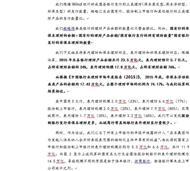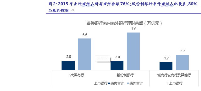 非保本理财已经占比超过70%。2015年末各银行理财产品余额共计23.5万亿元,根据我们的估算,表内理财约5.7亿元,表外理财规模约17.8万亿元。其中,国有5大行,表内理财规模2.0万亿,表外理财6.6万亿;股份制上市银行,表内理财规模2万亿,表外理财7.9万亿;农商城商行,表内理财1.7万亿,表外理财3.2万亿。股份制银行发行非保本理财更多,而城商行等其他银行表外理财发行量较少。