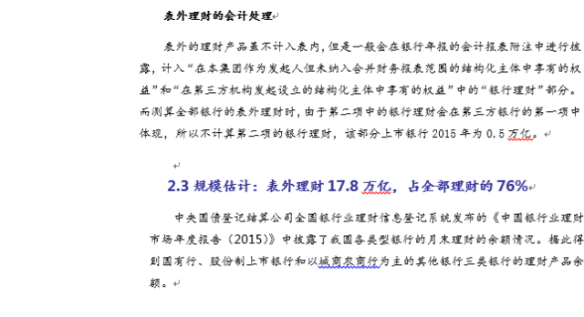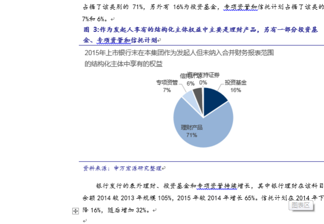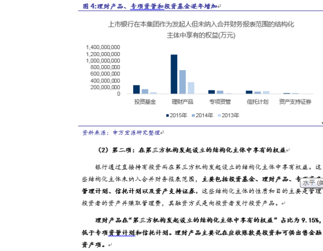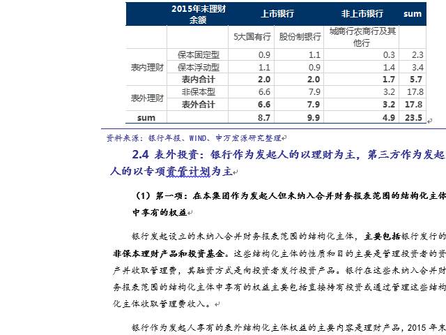 表内理财包括保本保息和保本浮动两种理财,表外理财主要为非保本型理财。(1)表内理财会计处理:目前主要有三种方法:第一种是把理财资金计入公用价值计量且变动计入当期损益的金融负债。第二种是计入吸收存款,有7家银行采用了这种方法。第三种是将理财计入其他负债。光大、招商、中国银行、民生银行没有在资产负债表中明确列出理财所记录科目或者没有披露保本理财情况。(2)表外理财的会计处理:一般会在银行年报的会计报表附注中进行披露,计入“在本集团作为发起人但未纳入合并财务报表范围的结构化主体中享有的权益”和“在第三方机构发起设立的结构化主体中享有的权益”中的“银行理财”部分。银行作为发起人享有的表外结构化主体权益的主要内容是理财产品,2015年占比71%。理财产品在“第三方机构发起设立的结构化主体中享有的权益”占比为9.15%,低于专项资管计划和信托计划。理财产品主要记在应收账款类投资和可供出售金融资产项。