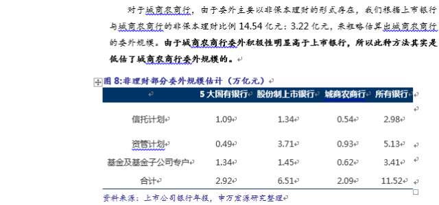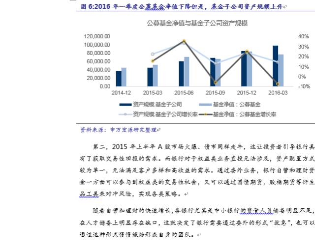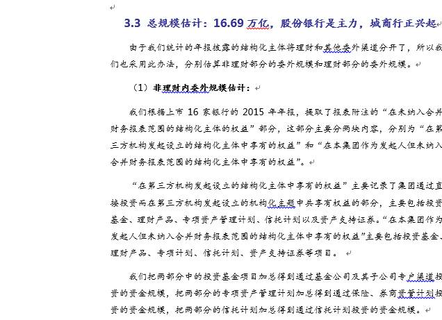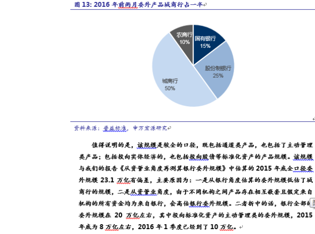 值得说明的是,该规模是较全的口径,既包括通道类产品,也包括了主动管理类产品;包括投向实体经济的,也包括投向股债等标准化资产的产品规模。该规模与我们的报告《从资管业角度再测算银行委外规模》中估算的2015年底全口径委外规模23.1万亿有偏差,主要原因为:一是从银行角度估算的委外规模低估了城商行的规模,二是从资管业角度,由于不同机构之间产品存在相互嵌套且假定来自机构的所有资金均为来自银行,会高估银行委外规模。二者折中的话,银行全部的委外规模在20万亿左右,其中投向标准化资产的主动管理类的委外规模,2015年底为8万亿左右,2016年1季度已经到了10万亿。详见报告《从资管业角度再测算银行委外规模》。