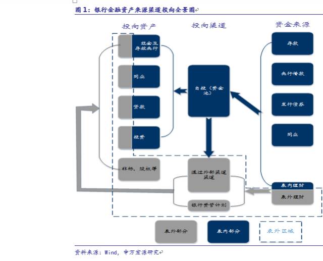 存款、央行同业、借款、同业、表内理财主要通过银行直投,投向资产为现金及存放央行、货币、贷款和债券,还有少部分可以通过外部渠道投资以上资产和非标。表外理财主要通过外部渠道和银行资管计划投向包括非标内的各类资产。