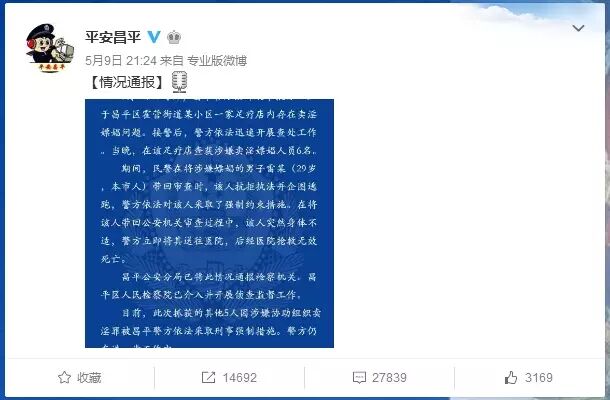 5月9日21点24分,北京市公安局昌平分局通报,5月7日20时许,警方接群众举报,昌平霍营某足疗店内存在卖淫嫖娼问题,当晚警方查获涉嫌卖淫嫖娼人员6名。在带回审查过程中,雷洋突然出现身体不适,后经医院抢救无效死亡。昌平区人民检察院已介入并开展侦查监督工作。