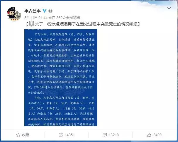 5月11日1点44分,北京市公安局昌平分局通报查处细节,雷洋在抓嫖过程中试图逃跑,激烈反抗咬伤民警,并将民警所持视频拍摄设备打落摔坏,后被控制带上车。行驶中,他又突然挣脱看管,从车后座窜至前排副驾驶位置,踢踹驾驶员迫使停车,打开车门逃跑。再次被抓后,带回审查途中,身体不适,送往医院后抢救无效死亡。民警在足疗店内将1男4女等5名涉嫌违法犯罪人员抓获。经审查并依法提取、检验现场相关物证,证实雷洋在足疗店内进行了嫖娼活动并支付200元嫖资。