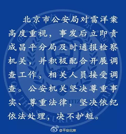 5月19日,北京市公安局表态,对雷洋案高度重视,事发后立即责成昌平分局及时通报检察机关,并积极配合开展调查工作,相关人员接受调查。依法依纪处理雷洋案,决不护短。