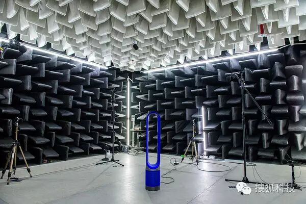有细心的人一定会问,这么高转速的马达,运转过程中一定会产生噪音,戴森的产品是如何控噪的呢?戴森为此也专门设置了声学实验室,最主要的核心部分则是我此前在很多消费电子厂商也常见到的半消音室,墙壁内侧布满巨大的锥形吸音海绵,用以消除回音。每次实验,都会将戴森的产品放在室内中央位置通电运转,室内周遭不同距离以及高度使用高灵敏度定向采音麦克风,对噪音进行采样分析,结果回传给马达实验室,马达工程师以及空气动力等领域的工程师会综合声学改进需要,对马达的叶片或者结构形状进行微调。