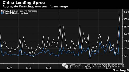 下图是2010年至今中国社会总融资(TSF)和新增贷款上升的情况,资料来源彭博。