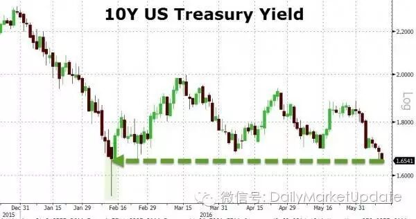下图是2015年12月底至今美国十年国债收益率持续下降的情形,目前是到达了1.65%。