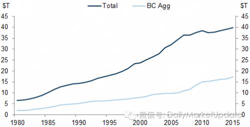 先以美国为例,根据美国证券和金融市场协会的数据,目前美国债券市场的总面值是40万亿美元,这个债券包括国债,联邦政府机构债券,房地产按揭,公司债,市政债,和ABS资产抵押债券。而根据剔除了按揭等债券的巴克莱美国Aggregate 总体债券指数,这个数字是17万亿美元。下图是从1980年到2015年美国总债券面值金额(深蓝线)和巴克莱美国总债券金额(浅蓝线)逐年增加的情况。从2000年以来,美国债券总面值增长了60%。