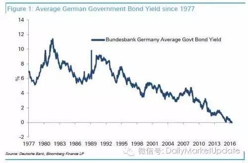下图是1977年以来至今德国国债收益率下降的情况: