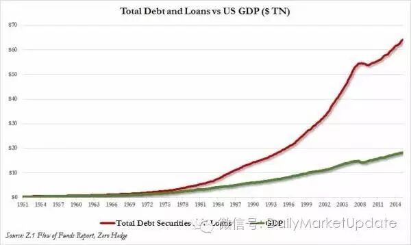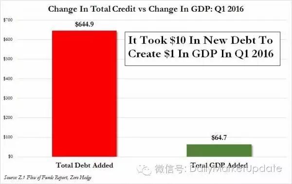 而在总的信用Credit方面(总的Credit包括总债务Debt加上总贷款Loan),美国的总信用今年第一季度上升到64.1万亿美元的历史高位,比上个季度上升6450亿美元,而美国第一季度GDP是18.23万亿美元,比上一个季度只上升了650亿美元,年化增长率是0.7%,也就是说,10美元的新债只创造了一美元的经济增长。