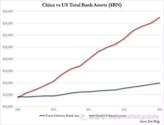 下图是中国各大银行(红线)和美国银行(蓝线)的总资产扩张情况,单位十亿美元。