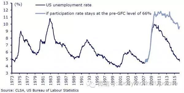 上周世界银行更是削减了全球GDP增长率,QE量化宽松和ZIRP货币政策执行8年以来,所希望的经济增长,通胀目标并没有达到,失业率水平也依然处在高位。以各大经济体唯一亮点,唯一处在加息通道的发达国家主要经济体-美国为例,美国目前失业率水平是4.7%似乎已经超过了5%的FED政策目标,但是这个水平并未考虑到几十年以来最低的劳动参与率水平,也就是说并没有统计那些选择离开就业市场的劳动力,根据CLSA, 如果假设美国劳动参与率水平维持在危机前的66%,那么失业率应是9.6%,而考虑到劳动参与率的美国U6失业率是9.7%。