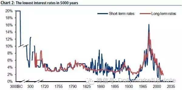下图是美洲银行美林提供的5000年来世界的利率水平(红线为长期利率,蓝线为短期利率)