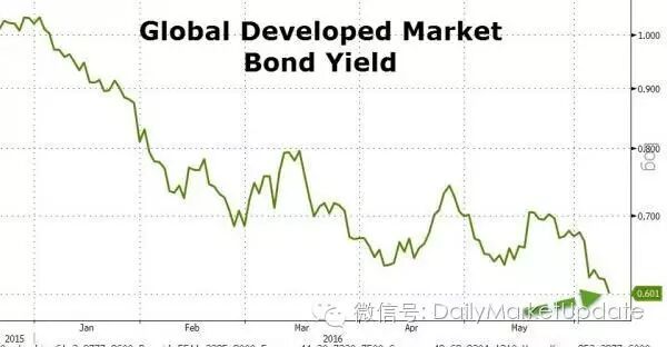 下图是全球成熟市场债券指数收益率水平从2015年到2016年继续下降的情况。目前是0.601%。