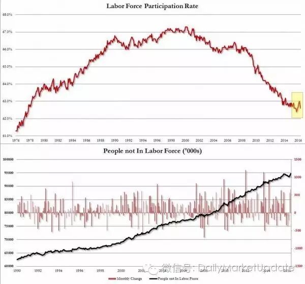 下图是从1926年到2015年美国的劳动参与率水平下降的情况(图中上部),不在就业队伍的适合就业人数上升的情况(图下部),目前达到9470万: