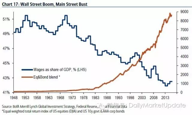 出现了华尔街Wallstreet投资繁荣和Mainstreet大众就业和工资萧条的反差,下图是美洲银行美林统计的1948年至今美国股票债券市场总体回报指数上涨(红线)和工资占GDP百分比比率下降的情况(蓝线),必须指出的是,和银行总资产上升一样,中国也有类似的情况。