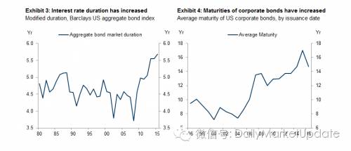 下图左是巴克莱美国总债券指数计算的总债券久期从1980年至今上升的情况,下图右部是2006年到2016年美国公司债平均期限上升的情况。
