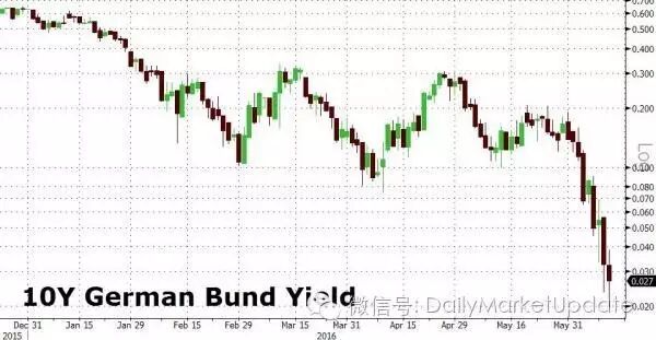 下图是德国10年国债Bund收益率从2015年年底至今下降的情况,目前是0.02%。