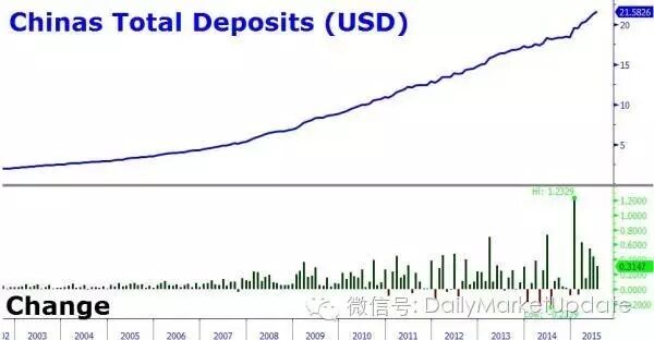 下图是2002年至今中国上升的总存款水平。