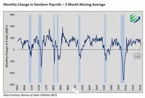 下图是1965年到2016年至今美国非农就业月度变化情况,灰色区域是经济衰退期。