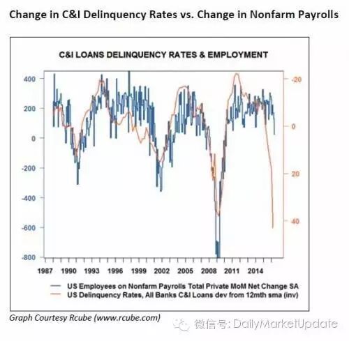 下图是1987年至今美国工商业贷款违约率Delinquency Rate(红线)和非农就业数量变化(蓝线)的对比: