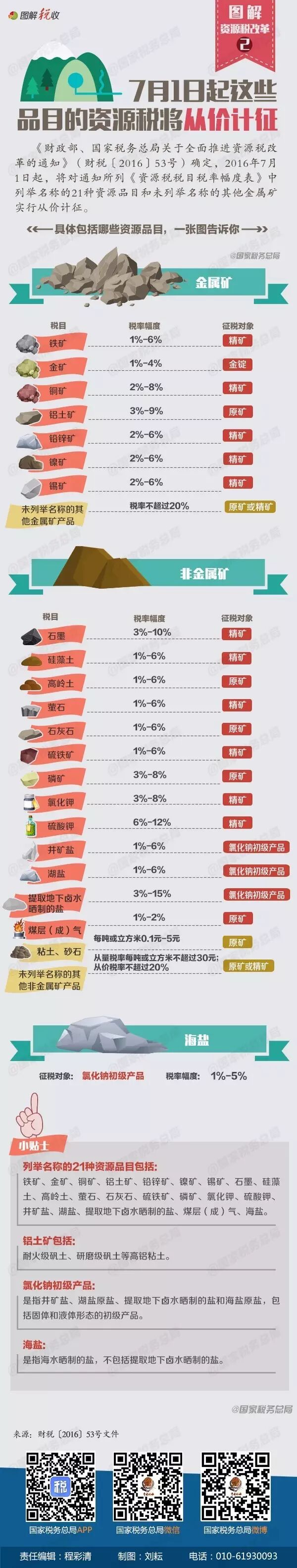 来源:国家税务总局《财政部、国家税务总局关于全面推进资源税改革的通知》(财税〔2016〕53号)确定,2016年7月1日起,将对通知所列《资源税税目