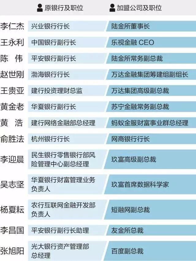 在这 60 多名离开传统银行的高管中,有少数去了民营银行,比如网商银行行长为杭州银行原行长俞胜法,微众银行两任行长曹彤和李南青,一位是中国进出口银行原副行长、一位曾任平安银行的零售业务总监。此外还有个别的离职者自己开始创业,比如曾任广东南粤银行副行长的柳博就创办了自己的大数金融公司。