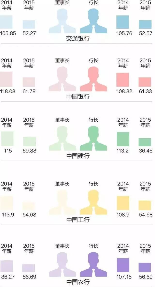 在 " 限薪令 " 实施一年后,五大国有银行高管在 2015 年普遍降薪 4 成。其中,中国建设银行行长的总薪酬从 113.2 万元直降到 34.46 万元,降幅接近 7 成。