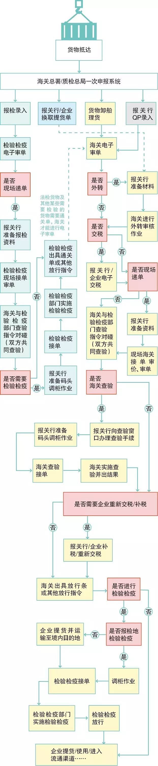进口集装箱货物在到达口岸后,需经过一系列的放行流程,其中涉及海关、检验检疫部门、报关行/企业的多方协作。