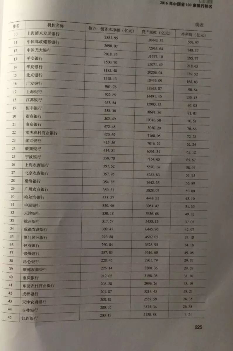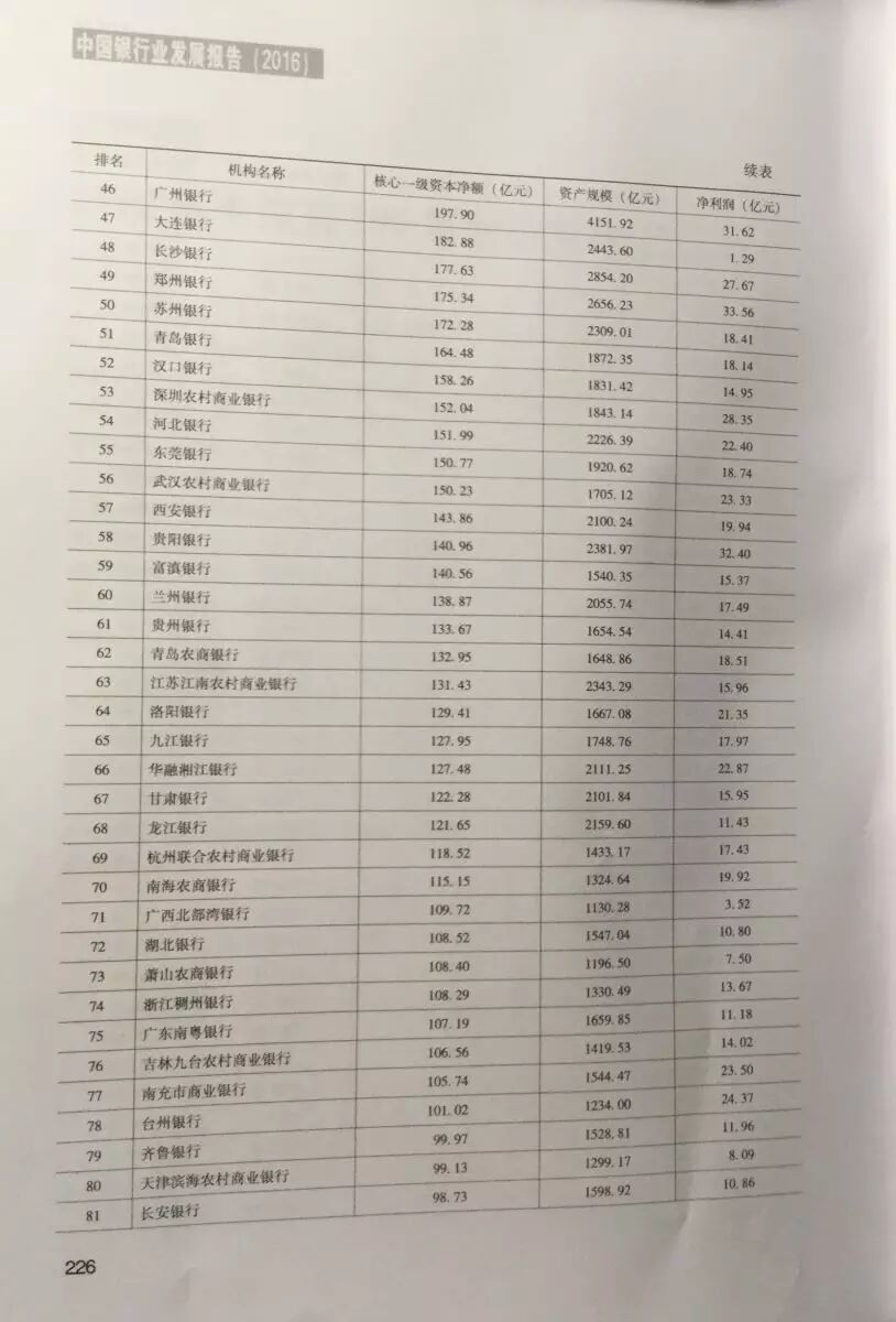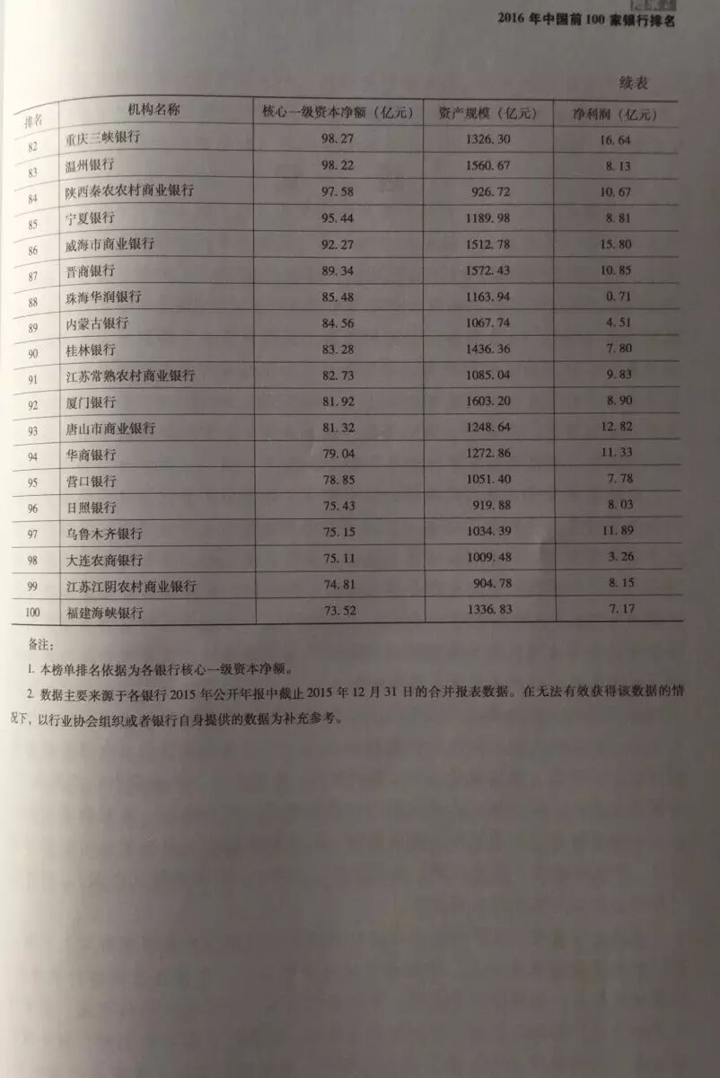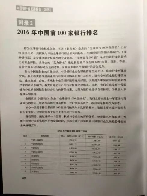 2016年7月8日,中国银行业协会在京召开“《中国银行业发展报告(2016)》发布会。会上首次发布了中国前100家银行排名(以核心一级资本净额排序)榜单。