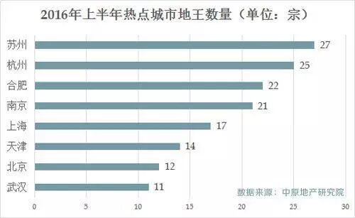 中原地产研究院提供的数据显示,今年1—6月份,全国50个主要城市诞生的“地王”(统计口径为单宗土地金额超过10亿元的地块)多达219宗,其中的热点城市苏州拍出27宗、杭州25宗、合肥22宗、南京21宗、武汉11宗、天津14宗。