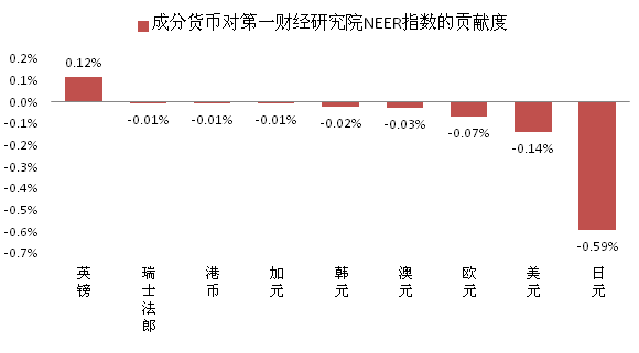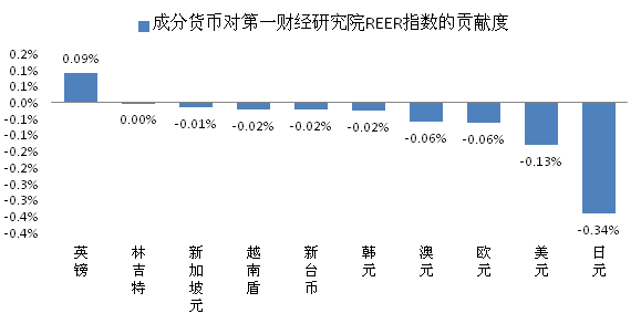 各国货币币值变化对第一财经研究院REER的影响与对第一财经研究院NEER的影响类似,周内人民币对日元、美元和欧元的贬值是该指数下跌的三个主因(图六)。